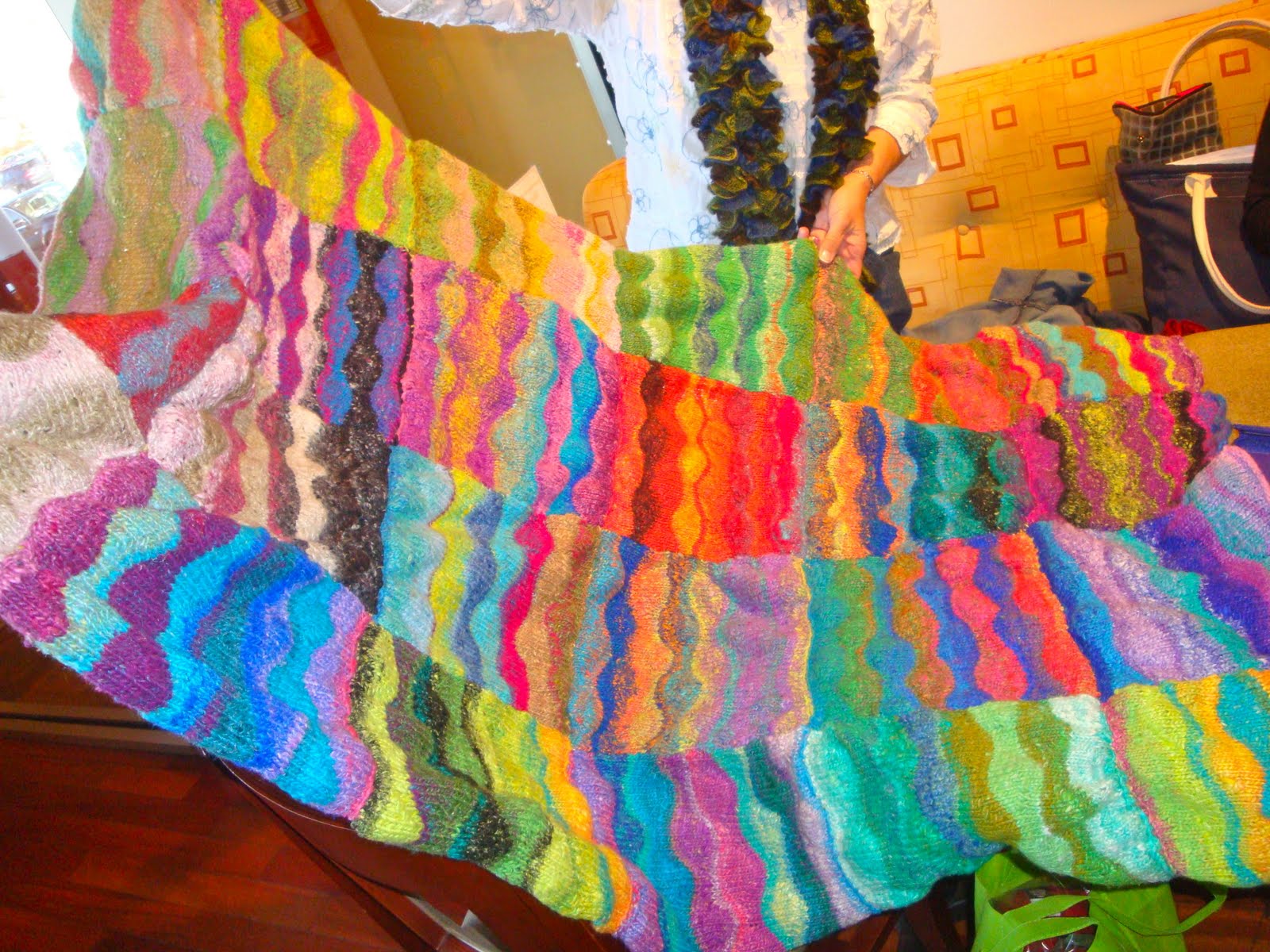 I'm being lazy with my photographs. Linda had to rip back to the armholes for her vest last week and reknit them due to some creative choices for decreasing. This is last weeks picture :). She's onto the right side of her