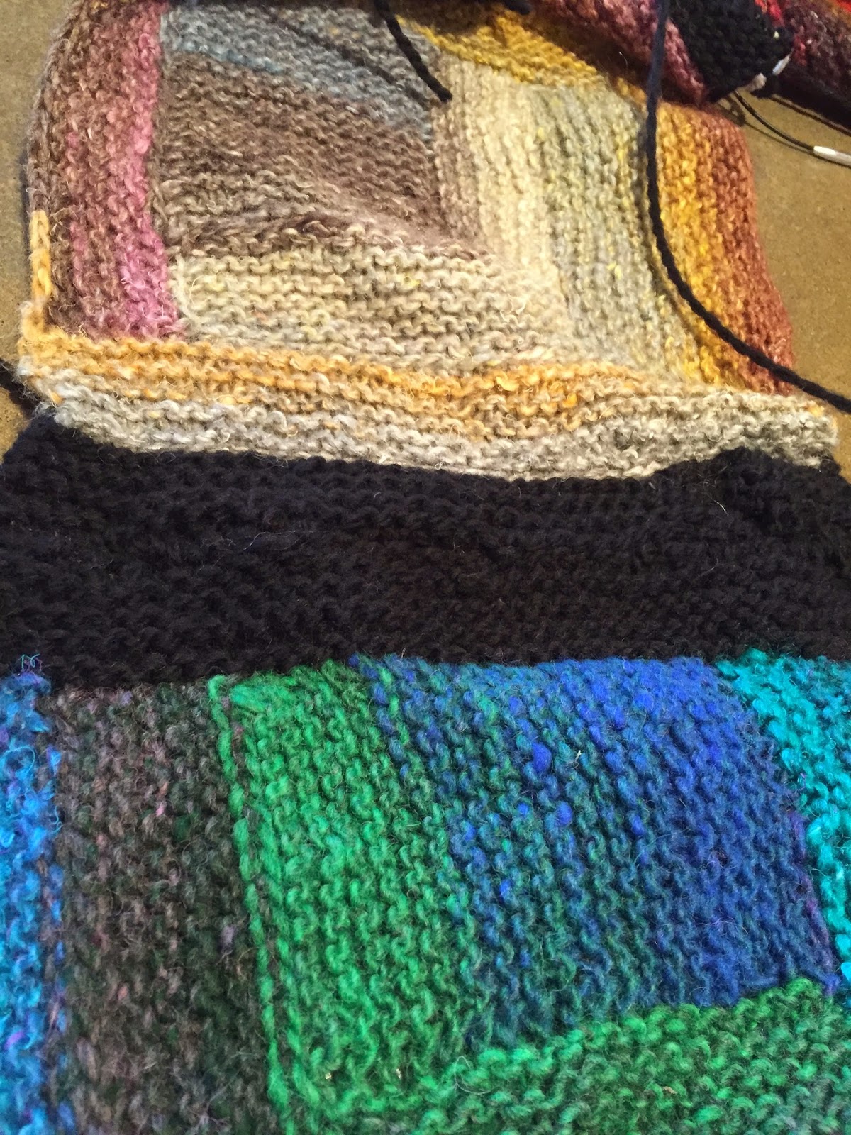 Seeing Sunaina's Noro Log Cabin Afghan last week motivated Elizabeth to bring out her Mitered Square Afghan. The yarns she's using are Silk Garden Chunky (discontinued) and Noro Retro for the border (also discontinued). She was debating whether or not to go down a needle. We thought not, it would've made it too dense.